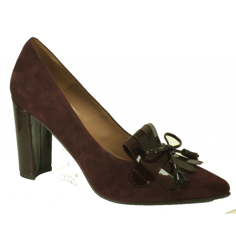 Zapatos de salón en ante borgoña, con adorno en charol